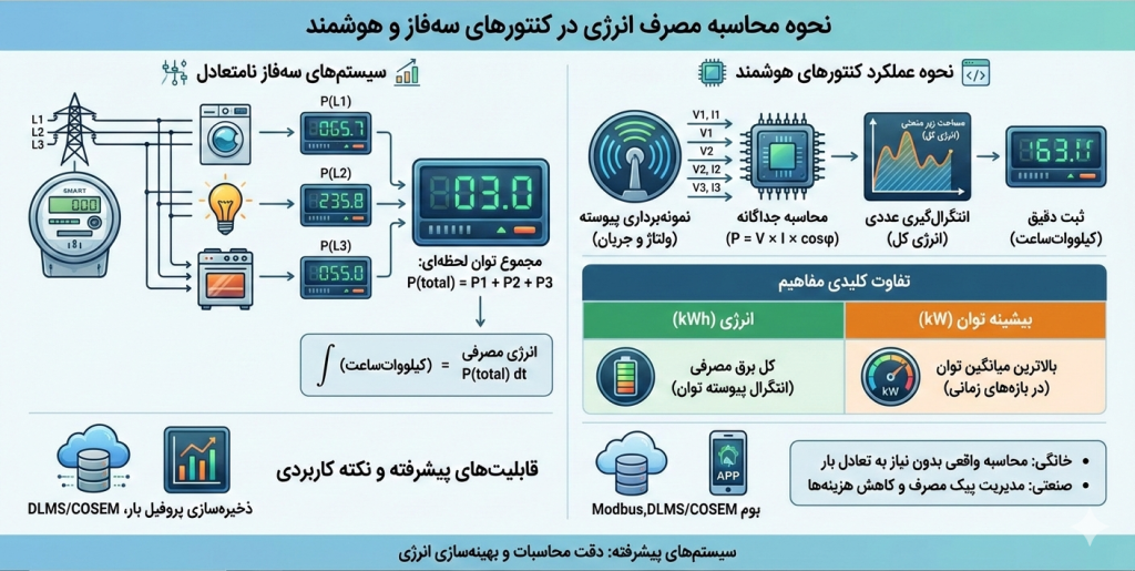 کنتورهای برق سهفاز مدرن، انرژی مصرفی (کیلوواتساعت) را بر اساس مجموع توان لحظهای هر فاز محاسبه میکنند، نه از طریق میانگینگیری یا انتخاب بیشترین جریان. این روش تضمین میکند که بارهای نامتعادل بهطور دقیق محاسبه شوند.